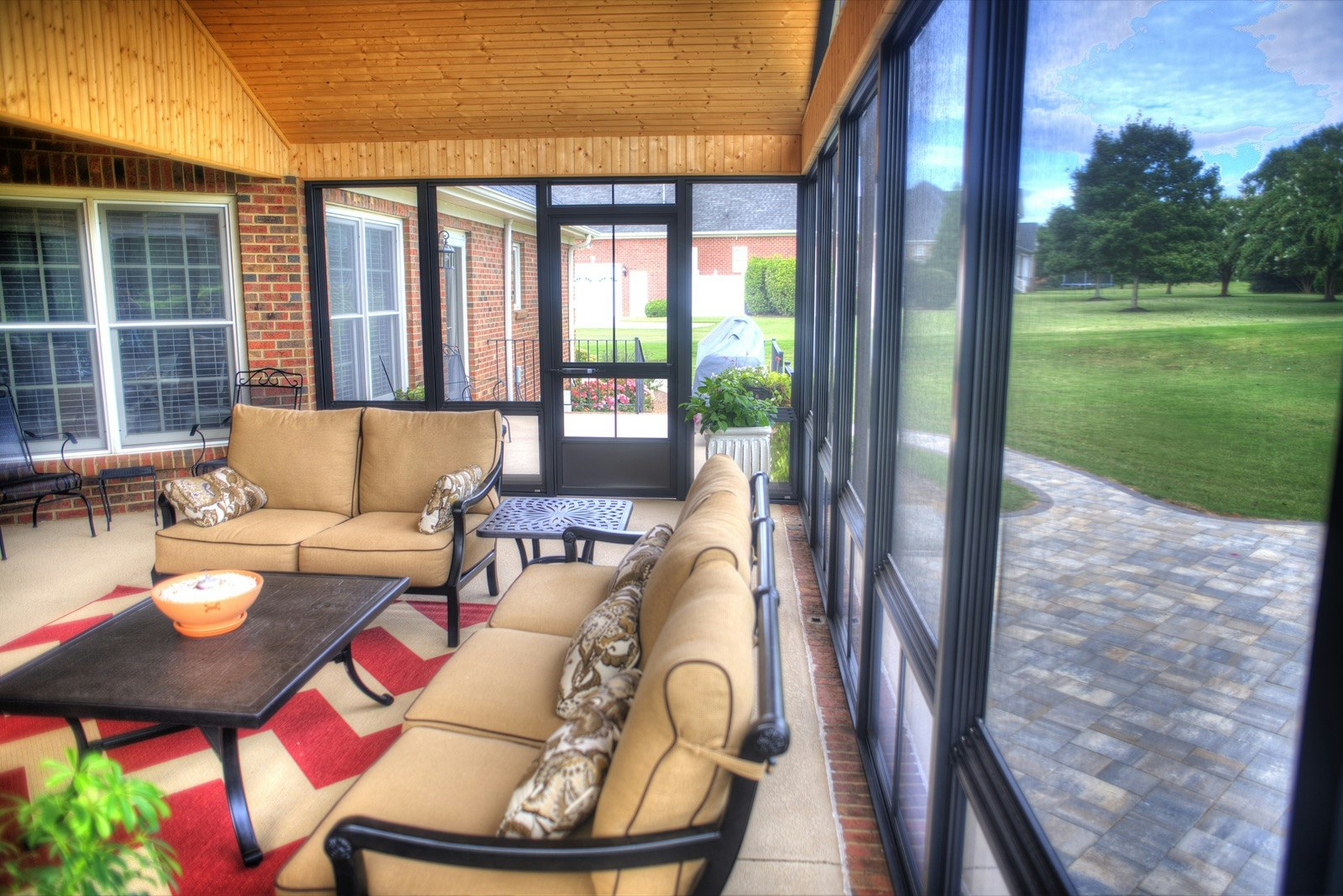 We installed a gable roof system over an existing concrete patio. Bronze framing is utilized to hold the Eze-Breeze sliding window system. It features an open style gable end, allowing for maximum visibility. The Eze-Breeze window system is a great way to enjoy the beautiful South Carolina summers without the pollen, insects, and intense heat.
